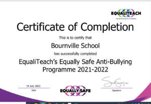 We are proud to call ourselves an ‘Equally Safe’ school. This year we have worked with Equaliteach, an organisation that specialises in promoting equality, inclusion and diversity. Bournville School is committed to promoting respect and tolerance and we have happily worked alongside Equaliteach this year to achieve the following: