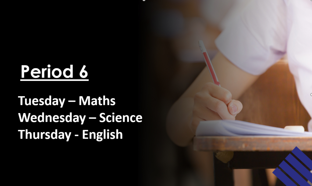 Every Tuesday, Wednesday and Thursday from January 2024 Period 6 will be running at 2.40pm till 3.40pm, for students in Year 11 for their core subjects.