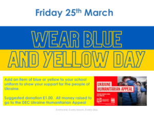 On Friday 25th March we held a blue and yellow uniform day, where staff and students visibly showed their support by wearing these colours. Money raised will go to the DEC Ukraine Appeal.