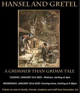 Performances of Hansel and Gretel take place on January 21st and January 22nd. All welcome! Find out more here: Hansel-and-Gretel-pre-order-tickets.pdf