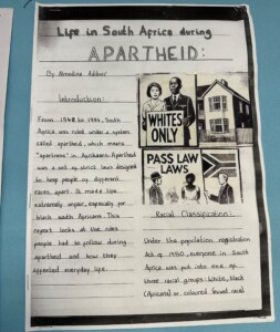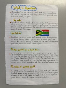 Here, Year 8 have completed homework on ‘Apartheid’ for Miss Keeber to help them to understand the book ‘Noughts and Crosses’ which they are studying this term.