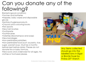 The school community has also been collecting items to send to help refugees from nappies to clothes. It has been a collective effort and has encouraged our students to develop empathy and promotes kindness.