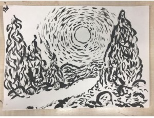 Vincent van Gogh often created landscapes using ink and willow sticks, Year 8 used these exact materials to create these expressive landscapes.